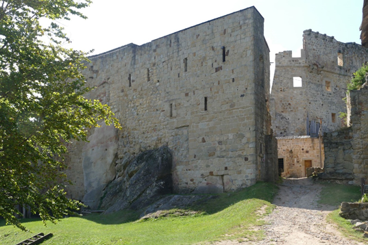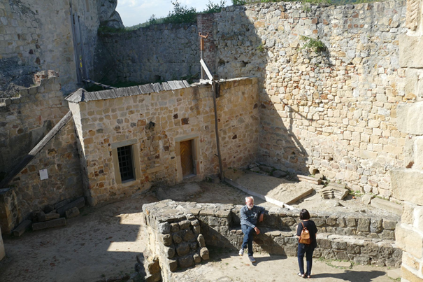 Dziedziniec zamku niższego jest oddzielony od zamku wysokiego murem granicznym (w związku z podziałem majątku). Wspólną dla obu części była kaplica i studnia. W 1530 r. Klemens Kamieniecki sprzedał swoją, niższą, wschodnią część Kamieńca Sewerynowi Bonerowi – bankierowi królowej Bony Sforzy. Jako wiano ślubne zamek przeszedł w ręce Jana Firleja herbu Lewart, marszałka wielkiego koronnego. Górny zamek nabył Jan Skotnicki i w 1606 roku przed sądem w Krośnie rozpoczął się proces między Piotrem Firlejem a Janem Skotnickim o prawo do korzystania ze studni zamkowej. Jan Skotnicki odremontował zamek i przebudował dach w taki sposób, że wody deszczowe spadały na dziedziniec Firlejów. Stało się to przyczyną długiego sporu Skotnickich i Firlejów uwiecznionego w Zemście Aleksandra Fredry. Jan Skotnicki jest w niej Rejentem Milczkiem. W komedii tej Firlej napadł na jego robotników naprawiających mury górnego zamku i zniszczył przy okazji rynny. Skotnicki pozwał go przed sąd i wygrał sprawę, ale kres ich długoletnim zatargom, położył dopiero ślub zawarty w 1638 roku przez wojewodzica Mikołaja Firleja (Wacława), z kasztelanką Zofią Skotnicką (Klarą).
